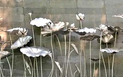 酒店不銹鋼雕塑以美為主,一般為裝飾性美陳景觀雕塑,常見于酒店大門、大堂、園林。包括但不限于水景景觀類,如圓環、噴泉、鏤空球;裝飾美陳類,如蓮花、翅膀、鵝卵石、水滴等。